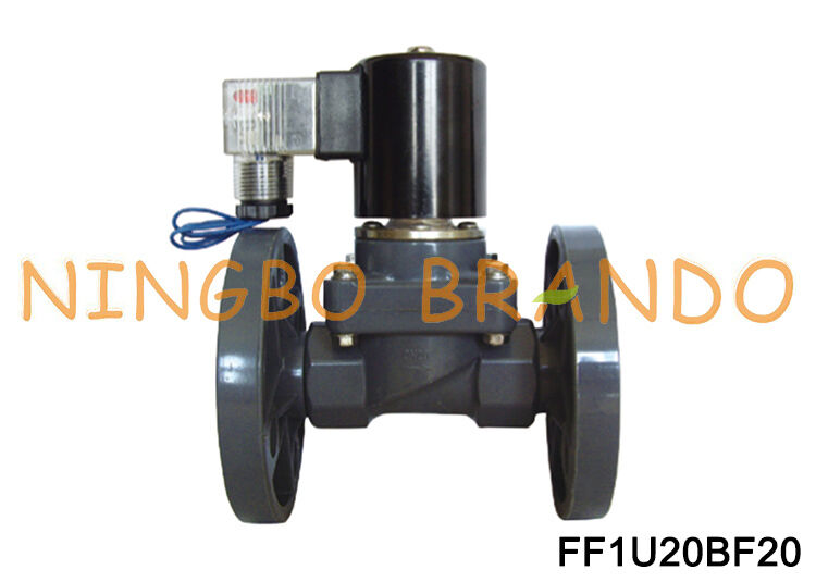 This is an anti corrosive UPVC solenoid valve, 3/4'' flange type, 20mm orifice size, 2 way normally closed, piston pilot operated, 0.1 to 6 bar working pressure, can be EPDM or FKM seal to suit different working mediums, various voltages for your choice, such as 12VDC, 24VDC, 24VAC, 110VAC and 220VAC, etc. It is used for a wide arrange of industrial applications to control fluids.
